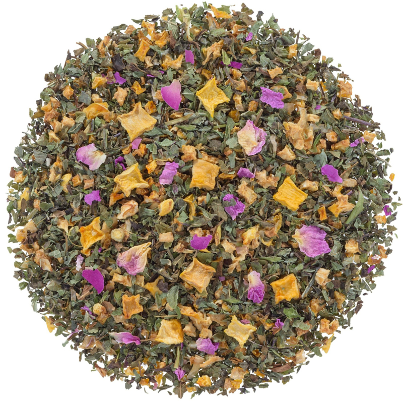 Het pittige van munt combineert goed met de frisse smaak van citrus en melisse. Rozenblaadjes zorgen voor zachtheid en het zoete van pompoen maakt deze blend compleet.